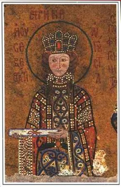 ζησε τόν 12ο αἰῶνα μ.Χ. καί ἦταν κόρη ὡραῖα καί ἐνάρετη. Αὐτό τό παρατήρησε ὁ βασιλιάς Ἀλέξιος ὁ Κομνηνός καί τήν πάντρεψε μέ τό γιό του Ἰωάννη, τόν ἐπονομαζόμενο Καλοϊωάννη λόγω τῶν πολλῶν του ἀρετῶν. Ἡ ἐνάρετη λοιπόν βασίλισσα Εἰρήνη, ξόδευε μέ ἁπλοχεριά σέ φιλανθρωπικά ἔργα. Μόνη μάλιστα πήγαινε σέ φτωχικές καλύβες, γιά νά δώσει ὄχι μόνο χρήματα, ἀλλά καί ἀνώτερη ἐνίσχυση καί παρηγοριά τῆς ἐλπίδας στόν Χριστό. Ἐπίσης ἔκτισε γηροκομεῖα καί ξενῶνες, καί ἄφησε σ’ αὐτά μεγάλα χρηματικά ποσά γιά τήν ἀσφαλή καί ἄνετη συντήρησή τους. Στή συνέχεια ὅμως, ἡ Εἰρήνη δοκίμασε μεγάλες θλίψεις. Ὁ ἄντρας της σέ μιά ἐκστρατεία του στή Συρία τό 1143, πέθανε. Ἀργότερα τό ἴδιο συνέβη καί μέ τά δυό ἀπό τά τέσσερα παιδιά της. Τότε ἡ Εἰρήνη, θέλησε νά βρεῖ ἀνακούφιση στίς θλίψεις της μέσα στή μοναχική ζωή. Ἀφοῦ λοιπόν πῆρε καί τή συγκατάθεση τοῦ βασιλιά γιοῦ της Μανουήλ, ἀποσύρθηκε στή μονή Παντοκράτορος, ὅπου καί ἔγινε μοναχή, μετονομασθεῖσα Ξένη. Ἐκεῖ τήν βρῆκε ὁ θάνατος καί τήν κήδευσαν μέ μεγάλη ἁπλότητα, ὅπως ἡ ἴδια τό ἐπιθυμοῦσε. Διότι λίγο πρίν πεθάνει ἔλεγε, ὅτι ἡ βασίλισσα Εἰρήνη εἶχε πεθάνει πρό πολλοῦ, καί δέν ἔμενε πλέον παρά μόνο ἡ μοναχή Ξένη.