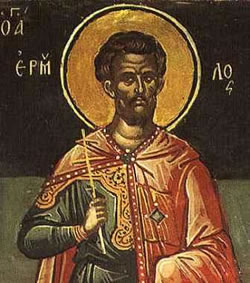 Ἱερατεύσαντες, γνησίως Ἅγιοι, τῷ πρυτανεύσαντι, ὑμῖν τά κρείττονα, τοῦ μαρτυρίου τήν ὁδόν, ἠνύσατε γηθοσύνως, ἱερέ Ἑρμόλαε, σύν Ἑρμίππῳ Ἑρμόκρατες, τρίστυλον ἑδραίωμα, Ἐκκλησίας γενόμενοι· διό ἐκδυσωπεῖτε ἀπαύστως, σώζεσθαι πάντας πάσης βλάβης.