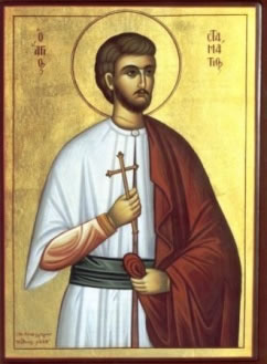Νομίμως ἀθλήσαντες, ὑπέρ Χριστοῦ τοῦ Θεοῦ, παμμάκαρ Σταμάτιε, σύν Ἰωάννῃ ὁμοῦ, αὐτάδελφοι ἔνδοξοι, σύναθλον δέ ἐν πᾶσι, τόν Νικόλαον σχόντες, δόξης τῆς τῶν Μαρτύρων, ἠξιώθητε ἅμα, πρεσβεύοντες τῇ Τριάδι, ὑπέρ τῶν ψυχῶν ἡμῶν.
