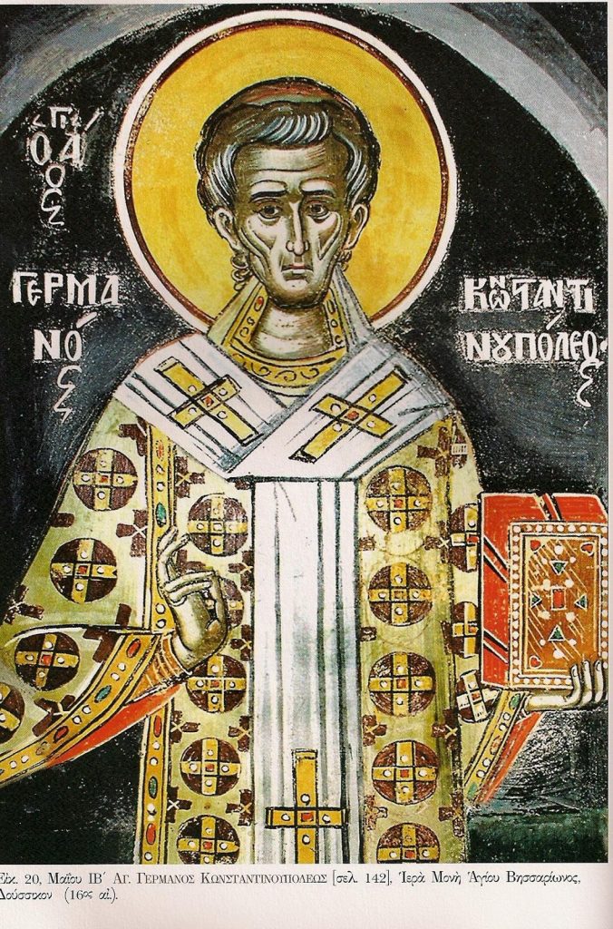 Σοφίας τοῖς δόγμασιν, ἐκπαιδευθείς εὐκλεῶς, φωστήρ ἐχρημάτισας, τῆς Ἐκκλησίας Χριστοῦ, ἐν λόγοις καί πράξεσι· σύμμορφος γάρ ὑπάρχων, τῆς εἰκόνος τοῦ Λόγου, λύεις Εἰκονομάχων, τήν ἀντίθεον πλάνην· διό σε Ἱεράρχα Γερμανέ, Χριστός ἐδόξασε