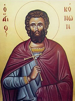Ἅγιος Μάρτυς Κόνων καταγόταν ἀπό τή Ναζαρέτ τῆς Γαλιλαίας καί ἔζησε κατά τά χρόνια τῆς βασιλείας τοῦ Δεκίου (249 – 251 μ.Χ.). Ἀφοῦ ἦλθε στήν χώρα τῆς Παμφυλίας καί διάλεξε μικρό τόπο, τόν μετασκεύασε σέ κῆπο φυτεύοντας λάχανα, ἀπό τά ὁποῖα προμήθευε τόν ἑαυτό του καί τούς πτωχούς ξένους μέ τροφή. Ἦταν στό χαρακτήρα ἁπλός, ὥστε καί αὐτούς ἀκόμα πού ἐπρόκειτο νά τόν συλλάβουν καί νά τόν ὁδηγήσουν στόν ἄρχοντα, γιά νά τιμωρηθεῖ ἐπειδή ἦταν Χριστιανός, ὅταν τόν ἀσπάσθηκαν μέ περιπαικτικό τρόπο, καί ἐκεῖνος τούς ἀνταπέδωσε τόν ἀσπασμό. Καί ὅταν τοῦ εἶπαν, ὅτι σέ καλεῖ ὁ ἡγεμόνας, ἀποκρίθηκε: «Γιατί; Ποιά ἀνάγκη ἔχει ἐκεῖνος ἀπό μένα καί περισσότερο πού εἶμαι Χριστιανός;». Οἱ στρατιῶτες τόν ἔδεσαν καί τόν ὁδήγησαν ἐνώπιον τοῦ ἡγεμόνος. Ἐκεῖνος τόν προέτρεψε νά θυσιάσει στά εἴδωλα. Ὁ Ἅγιος τότε εἶπε πρός τόν ἡγεμόνα μέ πνευματική ἀνδρεία: «Μακάρι, ἡγεμόνα καί ἐσύ νά μποροῦσες νά ἀπαρνηθεῖς τά εἴδωλα καί νά προσέλθεις στόν Χριστό». Τότε ὁ ἡγεμόνας ἔδωσε ἐντολή νά τόν βασανίσουν. Τοῦ τρύπησαν τούς ἀστραγάλους, τόν καθήλωσαν μέ σιδερένια καρφιά καί τόν ἀνάγκασαν νά τρέχει μπροστά ἀπό ἅρμα ἀλόγων.