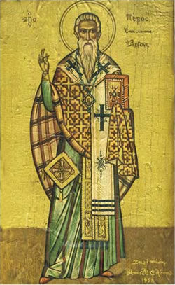 Τῷ Κορυφαίῳ τῶν σοφῶν Ἀποστόλων, συνωνύμησας εὐκλεῶς Πάτερ Πέτρε, τῶν τούτων κατετρύφησας ἁγίων δωρεῶν· ζήλῳ γὰρ τῆς πίστεως, εὐσεβῶς διαπρέψας, θαύμασιν ἐκόσμησας, τὸν σὸν ἔνθεον βίον· Ἱερουργὲ τῆς δόξης τοῦ Χριστοῦ, τοὺς σὲ τιμῶντας, κινδύνων διάσωζε.
