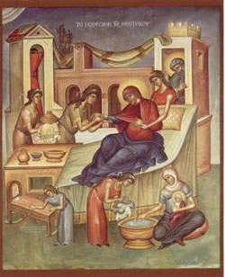 Ἡ γέννησίς σου Θεοτόκε, χαράν ἐμήνυσε πάσῃ τῇ οἰκουμένῃ· ἐκ σοῦ γάρ ἀνέτειλεν ὁ Ἥλιος τῆς δικαιοσύνης, Χριστός ὁ Θεός ἡμῶν· καί λύσας τήν κατάραν, ἔδωκε τήν εὐλογίαν· καί καταργήσας τόν θάνατον, ἐδωρήσατο ἡμῖν, ζωήν τήν αἰώνιον.