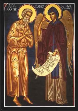 Πάχος ἀπορρίψας τό γεηρόν, πρός γνόφον εἰσέδυς, τῶν ἀΰλων θεωριῶν· ὅθεν ἐκομίσω, τάς θεογράφους πλάκας, Παχώμιε παμμάκαρ, ζωῆς τῆς κρείττονος.