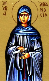 Ὁσία Ἀθανασία γεννήθηκε στή νῆσο Αἴγινα ἀπό γονεῖς εὐσεβεῖς κατά τόν 9ο αἰώνα μ.Χ. καί εἶχε μεγάλη κλίση γιά τά θεία. Οἱ γονεῖς της ὅμως, ὁ Νικήτας καί ἡ Εἰρήνη, τήν νύμφευσαν παρά τήν θέλησή της. Λίγες ἡμέρες μετά τόν γάμο, ὁ σύζυγός της φονεύθηκε ἀπό βάρβαρους πειρατές, πού ἐκείνη τήν περίοδο ἐπέδραμαν στήν Αἴγινα.