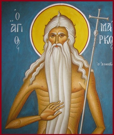Ὅσιος Μάρκος ἦταν Ἀθηναῖος καί ἔζησε τόν 4ο αἰῶνα μ.Χ. Ἀφοῦ ἔλαβε ἀξιόλογη μόρφωση, ἐγκατέλειψε τήν Ἀθήνα καί πῆγε στήν Ἀντιόχεια, ὅπου μαθήτευσε κοντά στόν Ἅγιο Ἰωάννη τόν Χρυσόστομο. Ἀργότερα ἐκάρη μοναχός καί ἀφιέρωσε τόν ἑαυτό του στήν μελέτη τῶν Θείων Γραφῶν καί ἔφθασε στόν ὕψιστο βαθμό τῆς ἀρετῆς. Φανερές ἀποδείξεις καί οἱ λόγοι πού ἐγράφησαν ἀπό αὐτόν γιά τήν ὠφέλεια καί τήν ἐνέργεια τῶν θαυμάτων. Γιατί κάποτε, ἐνῷ ἡσύχαζε, πλησίασε αὐτόν μία ὕαινα πού εἶχε τό παιδί της τυφλό, μέ ταπεινή στάση σάν νά παρακαλοῦσε νά τήν εὐσπλαχνισθεῖ γιά τήν τύφλωση τοῦ μικροῦ της. Καί ὁ Ὅσιος, ἀφοῦ κατάλαβε, ἔπτυσε στά μάτια τοῦ ζώου καί αὐτό βρῆκε τήν ὅρασή του. Μετά ἀπό ἡμέρες ἦλθε πάλι ἡ ὕαινα στόν Ἅγιο, μεταφέροντάς του τό δέρμα ἑνός μεγάλου κριαριοῦ ὡς ἀνταπόδοση γιά τήν θεραπεία. Αὐτός ὅμως δέν δεχόταν νά τό λάβει, προτοῦ τό θηρίο ὑποσχεθεῖ νά μήν βλάπτει πιά τά πρόβατα τῶν πτωχῶν.