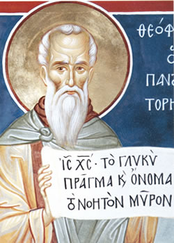 Τοῖς ἀνθρώποις Κύριος, θέλων γνωρίσαι τρισμάκαρ, ὅτι ἦν ὁ βίος σου, πάνυ εὐάρεστος τούτῳ, ἔδειξε, τό λείψανόν σου πηγήν τῶν μύρων, ἅπαντας, εὐωδιάζον τούς προσιόντας· διά τοῦτό σε τιμῶμεν, οἱ σοί ἱκέται, Θεόφιλε Ὅσιε.